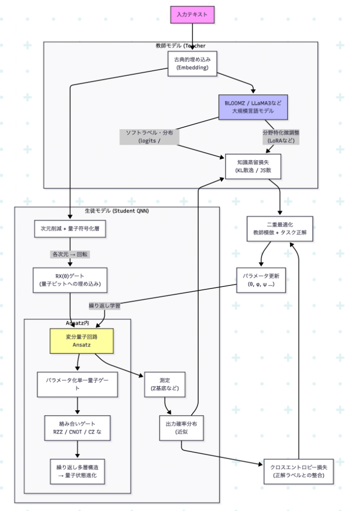 量子AIの最前線では、巨大なLLMの「知能」を、効率的な量子回路に移植する**量子知識蒸留(Quantum Knowledge Distillation: QD-LLM)**という新たな認知・学習モデルが注目されています。