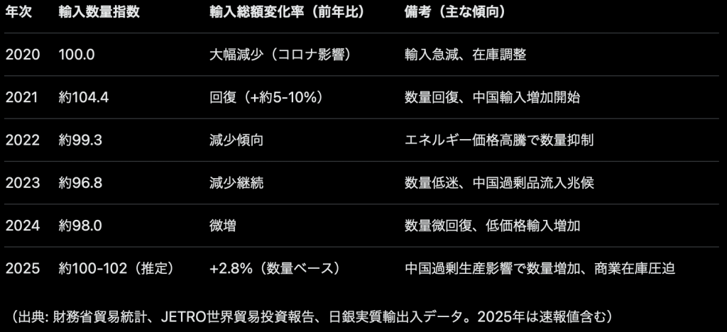 表4.輸入の経年推移(2020-2025年、輸入数量指数、2020年=100基準、年平均または年末値近似)