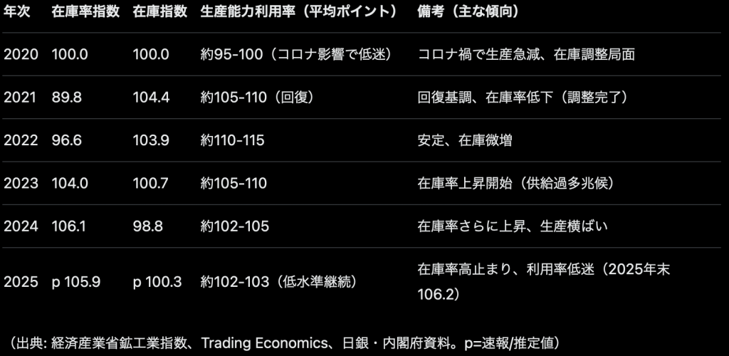 国内製造側: 2020年のコロナ低迷から2021-2022年に回復したが、2023年以降在庫率上昇・利用率低迷が続き、供給過多の慢性化。2025年末の在庫率106.2は高水準。