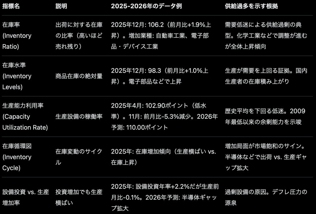 これらの指標は、国内事業所の生産・出荷・在庫を対象とし、輸入品は含まれません。経済産業省の鉱工業指数(IIP)に基づくデータで、国内生産の過剰を示します。