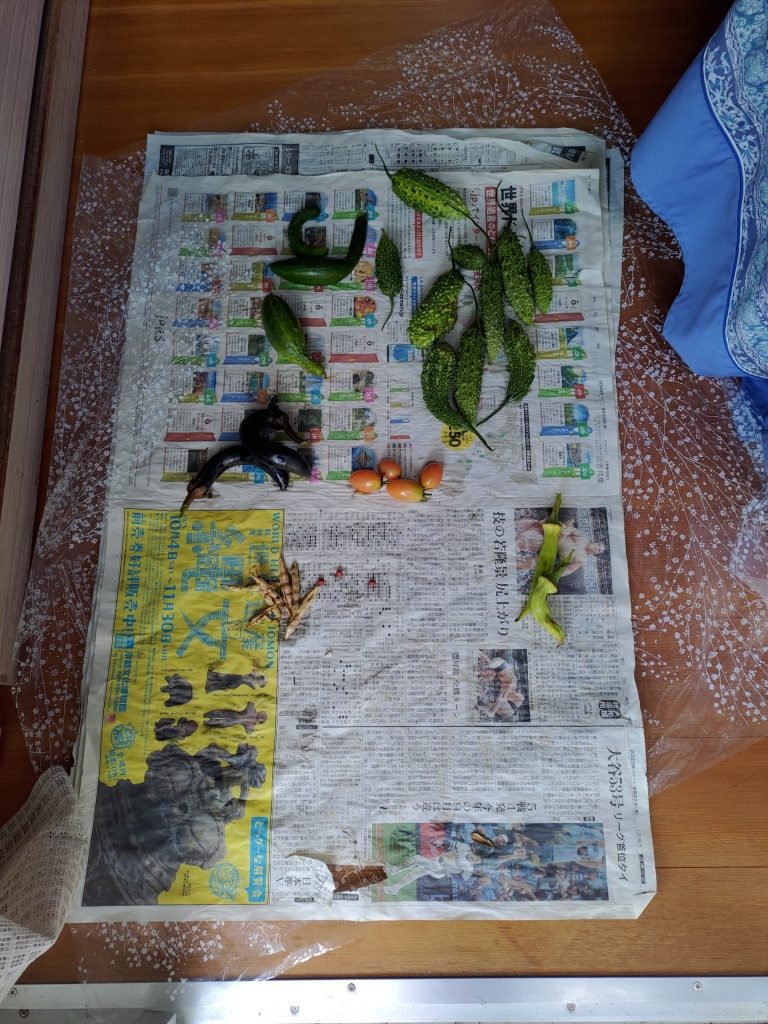 本日の収穫 きゅうり ごうや オクラ 茄子 プチトマト 小豆