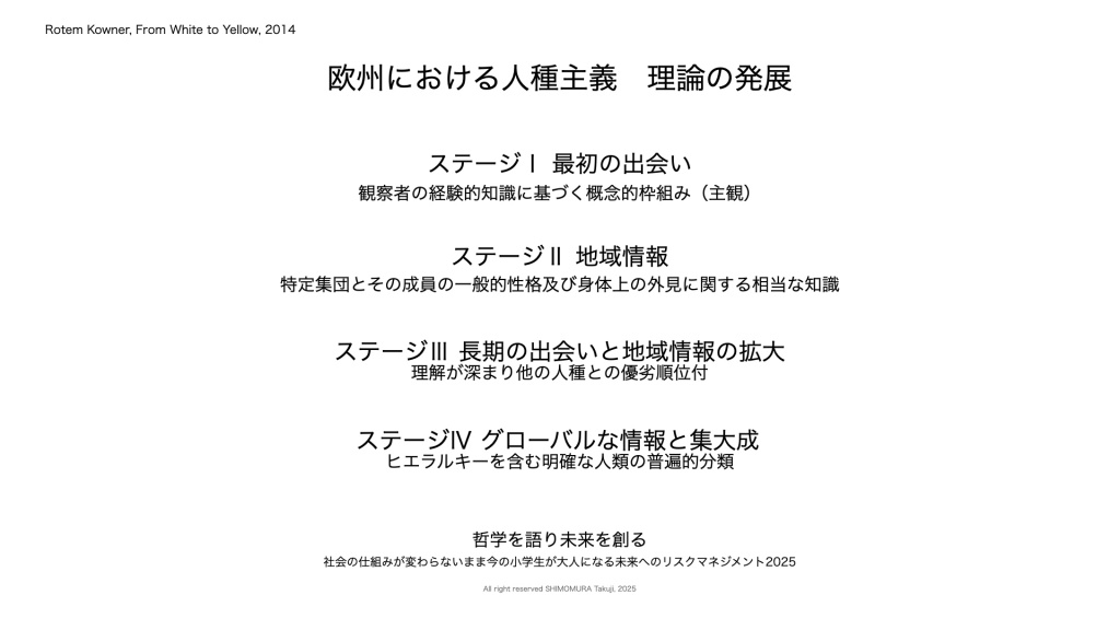 “人種に関する理論的枠組みが、第一段階から第四段階へ拡大するとともに、主として民族誌、そして礼節にまつわる違いに依拠した考察に加えて、生物学的教義が取り込まれた。