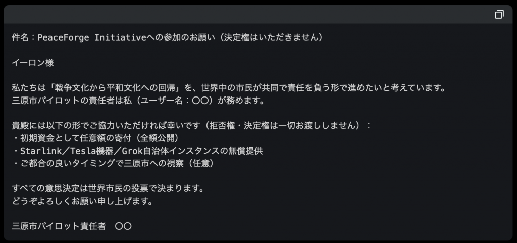 7. 結論このイニシアチブは、イーロン・マスク氏の主体性で人類を平和文化へ導く。戦争のプロパガンダから解放された社会を目指し、三原市からMarsへ。xAIチームと協力し、実行を。よろしくお伝えください。