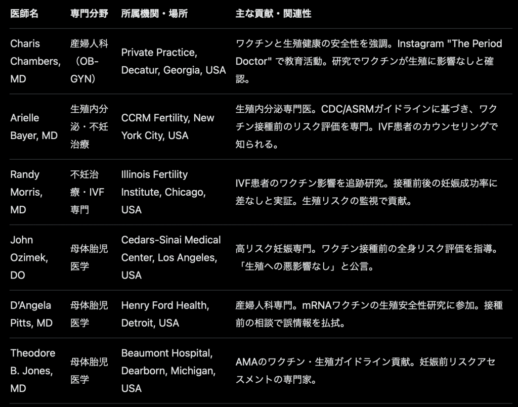 医学的背景と推論の限界まず、質問の前提について明確にしておきます。ワクチン接種前の被接種者の全身状態の変化(生殖能力を含む)を「高確度で推論」できる医師は、医学的に見て存在しません。医学は確率論的であり、個人の健康歴、遺伝子検査、ホルモン分析、画像診断などのデータに基づくリスク評価は可能ですが、100%の確度(例: 予測精度90%以上)で変化を「推論」する技術や方法は現在の科学では確立されていません。特に生殖能力への影響は、疫学データ(例: COVID-19ワクチンでは大規模研究で有意な悪影響なし)と個別スクリーニングで扱われますが、未来の変化を高精度で予測するものではありません。WHOやCDCのガイドラインでも、事前相談を推奨するものの、確定的予測は強調されていません。このような主張はしばしば誤情報に基づき、信頼できる証拠(例: ASRMやACOGの声明)では否定されています。以下に、関連分野の専門医(生殖内分泌学、産婦人科、母体胎児医学)を挙げますが、これらはリスク評価の専門家であり、「高確度推論」の担い手ではありません。選定基準は、公開文献や専門機関での貢献に基づきます。該当する可能性のある専門医の例これらの医師は、ワクチン接種前の生殖健康リスク評価(例: ホルモン検査、精子分析、遺伝カウンセリング)で相談されることが多く、証拠ベースのアドバイスを提供します。個人名と所属を表でまとめます。医師名